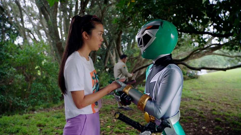 Izzy i Rangersi zdają sobie sprawę że jedynym sposobem na ocalenie Olliego jest zniszczenie posągu Triceratopsa.Izzy i reszta nie są zadowoleni gdy Aiyon przyprowadza do bazy Tarricka ich byłych wrogów - Slythera i Mucus uważając że nie można im ufać.Gdy Javi i Aiyon wraz z Tarrickiem pilnują Squilli ,Izxy wraz z Amelią i Fern przywołują Megazorda Formacji Smoka by powstrzymać powiększone Copyguardy które wysłała Bajillia.Po pokonaniu Copyguardów Izzy,Amelia i Fern pomagają Javiemu i Aiyonowi pokonać Bajillę w tym niszczą Squillę.Wtedy Izzy i reszta zdają sobie sprawę że Mucus i Slyther naprawdę są dobrzy.Gdy Zsyto o kolejnym użyciu mocy traci przytomność Izzy,Amelia,Javi i Fern podejrzewają że coś mu może być ,chociaż Aiyon i Solon próbują odwrócić ich uwagę od tego tematu,Zayto wyjawia że jeśli wyczerpię moc Władców wróci do sieci i ponownie umrze.Izzy i Rangersi wpadają na pomysł by Mucus i Slyther podstępem dostali się do bazy Zera by zniszczyć posąg.📺 ODCINEK: Zmiana Stron