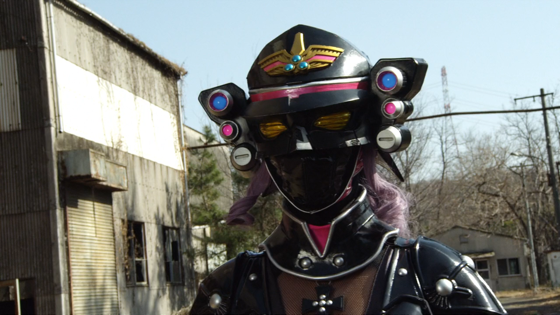 ©Na's appearance is a woman with long wavy purple-violet hair. She has blue eyes and wore dominatrix-esque outfit, fitting the "pain" theme of Akibaranger series. The outfit mainly consists of black army-like hat, one piece bodysuit and outer coat that exposes her cleavage and backside, it also has a touch of Nazi-esques as well. ©Na also wears thigh-long high heel-boots like traditional villainess in Sentai. She also wears fashion glasses with yellow lenses.