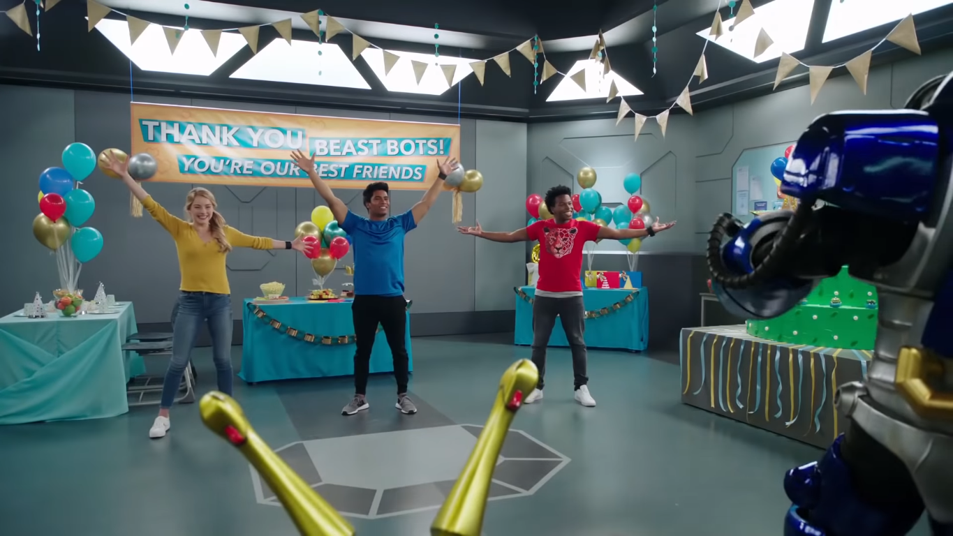 Back in Nate’s lab, Nate tries to understand Devon and Ravi’s situations, with the two claiming that Cruise and Smash made mistakes after obeying their commands. Zoey frustratingly enters the lab to ask if anyone has seen her tablet. Claiming that Jax put her tablet in the lab to charge, Zoey says that he didn’t and says that she sometimes would be better off without a Beast Bot, hurting Jax’s feelings just as he enters the room. Hearing this, Jax shows the tablet charging to Zoey and brings it over to her, saying that Zoey left her coat over it. Jax leaves upset with Zoey, Devon, and Ravi following him to a room where a party meant to be a surprise was set up at. Seeing this, Jax explains to Zoey that he, Cruise, and Smash wanted to throw a party for the Rangers. Initially thinking Jax was careless, Zoey realizes that this is the reason for the party supplies. The Beast Bot further explains that Cruise was helping and that is what caused him to be late for picking up Devon. Learning this, Ravi thinks and realizes that Smash got icing on his hands after he was frosting the cake. Jax tells Ravi that Smash felt terrible about ruining his shirt. He further explains that he and the other Beast Bots wanted to throw a party to thank the team for protecting the city. Feeling guilty, Zoey apologizes to Jax for taking him for granted with Zoey further explaining that she, Devon, and Ravi don’t deserve friends like their Beast Bots for their behavior. Nate enters into the party set to tell the team the reason why Blaze got the data on the Beast Bots was to pilot their Megazord. With Ravi explaining that they needed data on all three Beast Bots, Zoey realizes that’s why Blaze and Railtron were after Jax. With Devon explaining all three drives of data will allow Blaze to control the Megazord, Jax offers to bait Blaze and Railtron into a trap. Wanting to keep Jax safe, Zoey tells him no but Ravi explains that it may be the only way to save Cruise and Smash.
