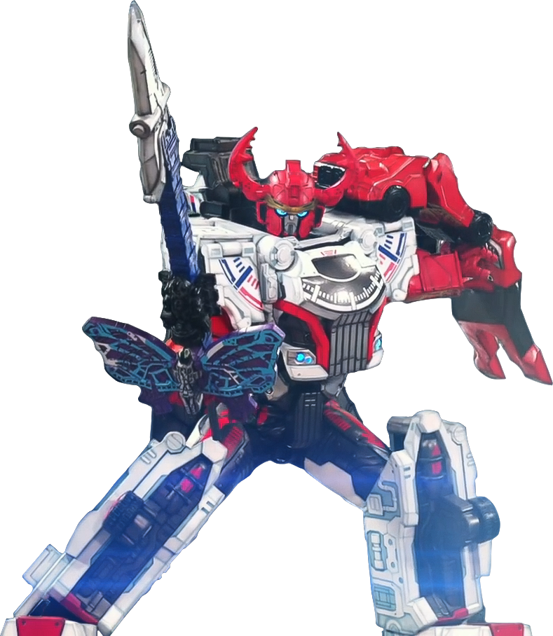 King Boonboomger Robo (キングブンブンジャーロボ Kingu Bunbunjā Robo) is an alternate combination of Boonboomger Robo where Boonboom Racing takes its position when forming Boonboomger Robo Knight (minus forming the head), God Tombo forms the wings and sword, and God Papillon forms the head and sword guard.[3]