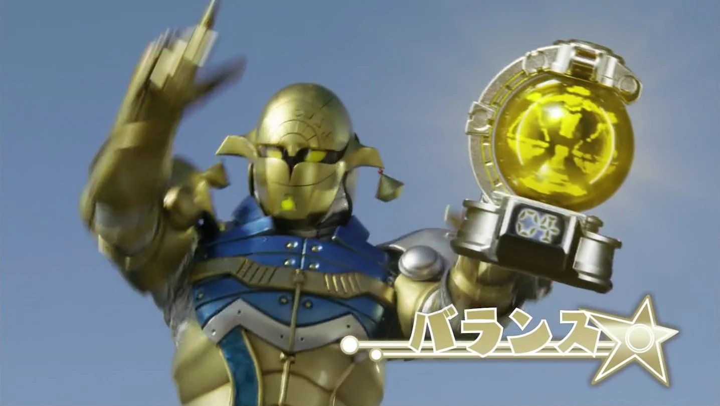 Balance (バランス Baransu) is Tenbin Gold (テンビンゴールド Tenbin Gōrudo, lit. Balance Gold), the Gold Ranger of the Kyurangers. He is a techno-organic mechanical organism, a thief and partner to Naga Ray. He is the seventh Kyuranger to be awakened. After the permanent defeat of Don Armage, he and Naga began to retrieve every stolen treasures which Jark Matter left behind.