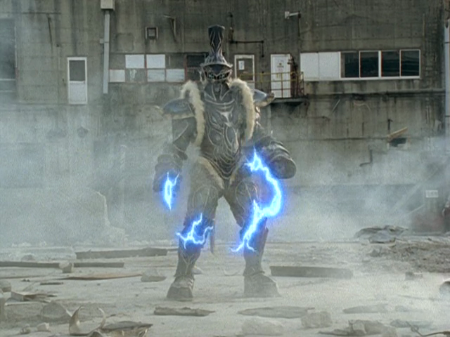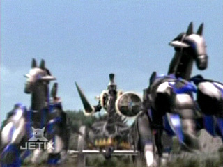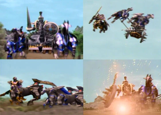 The Terror attacked the Manticore Megazord using his chariot, and again nearly defeated them. When it seemed that Black Lance would emerge victorious, Leanbow arrived in the form of Koragg's Knight Wolf Centaur and began attacking Black Lance. The knight accused the former Koragg of being a traitor and used the spikes on the wheels of his chariot to injure him. Leanbow managed to crash the chariot, and as the two fought, Necrolai planted Sculpin's fish scale on one of the wolf figureheads on his right shoulder. Leanbow then overpowered Black Lance and used a teleportation spell to drag Black Lance down into the Underworld, where the Knight-like Terror vowed that he would get his revenge on Leanbow.