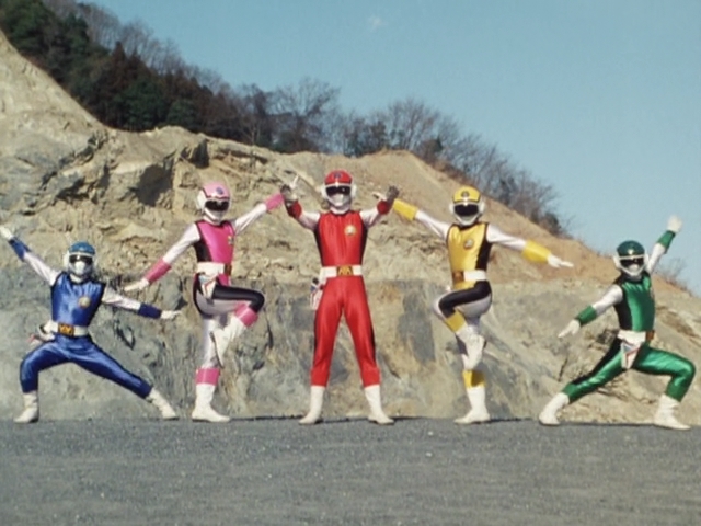 The Flashmen are seen alongside the Dekarangers, standing behind Space Sheriff Gavan Type G