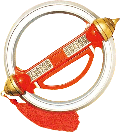 Dairinken (大輪剣 Dairinken): Chakram-like weapons given to the Dairangers by Grandmaster Yufang in episode 14. Each Dairanger has two and with Kiryoku they are able to launch them by placing one flat on one palm then hit it with the other or attach their individual Rod blades to them (which can also be launched). When used all together, the Dairangers can perform the finishing technique Dairinken Qi Power Shot, where they fill the Dairinkens with Qi then launch them by slamming their hand against the flat part of the weapon.