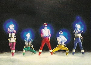 The Qi-Power Bomber (気力ボンバー Kiryoku Bonbā) are the core Dairanger's original team attack where they would collectively gather Qi into their hands and fire five balls of Qi energy that would combine into a single blast to finish off Gorma monsters. It was the only finisher that did not require an actual weapon to use and could also be used as an individual attack. Used primarily during the Dairanger's earliest battles, it later became obsolete after the Dairangers acquired the ability to use stronger attacks and weapons.