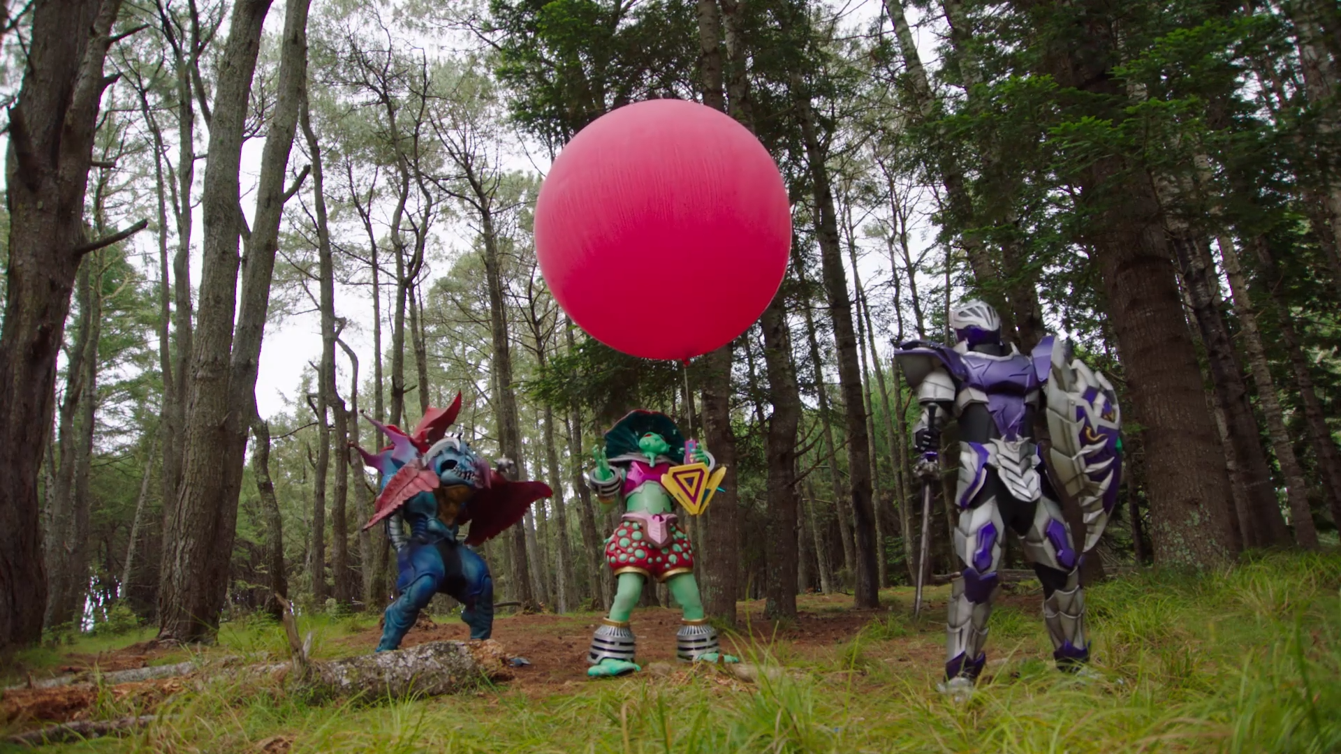 Mucus and Roostafa meet up with Void Knight in the woods, who has a giant balloon with a device on it. Mucus air-headedly thinks it is a birthday celebration, aggravating Void Knight who already explained their plan to her. Before she tries to answer, Roostafa explains that the balloon will lift the disruptor and block any form of communication, including the Rangers' teleportation system, impressing Void Knight. Before Void Knight can give the signal, Mucus lets the balloon loose early and it gets snagged on a tree.