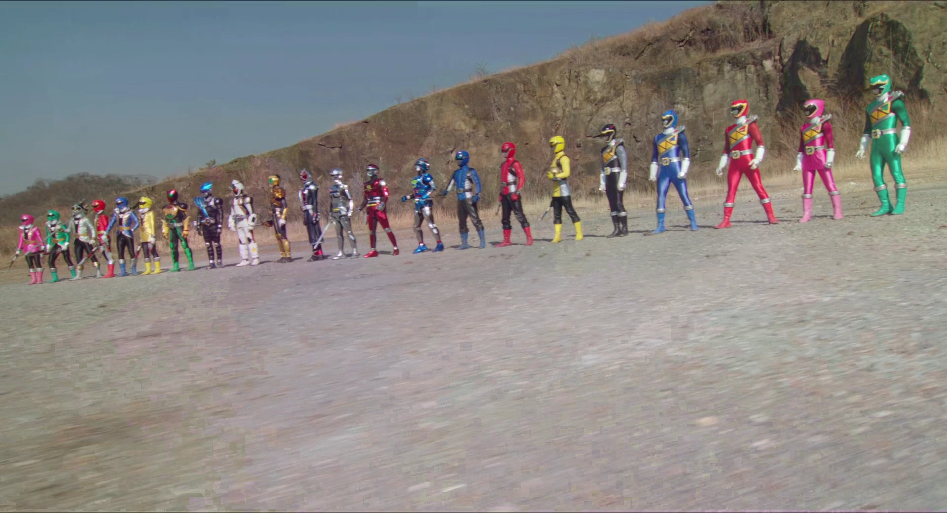 The five-man Kyoryuger team standing alongside the Go-Busters trio, as well as the Gokaigers, Kamen Riders, and Space Sheriffs