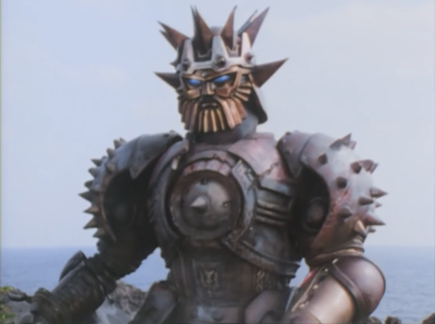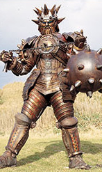 Degius (デギウス Degiusu, 40) is a wrecking ball-themed forced Majin. Degius was once a warrior of good who became corrupted. He is eventually killed after Black Merchant Biznella's mind control collar forces him evil again where the Balban used Degius as a conduit of energy, the energy source being a passing asteroid, to successfully revive Daitanix. After his death, GingaYellow turns Degius' sword into a monument of sorts to remember him by placing his sword on the beach to look like a cross gravestone sticking out of the sand.