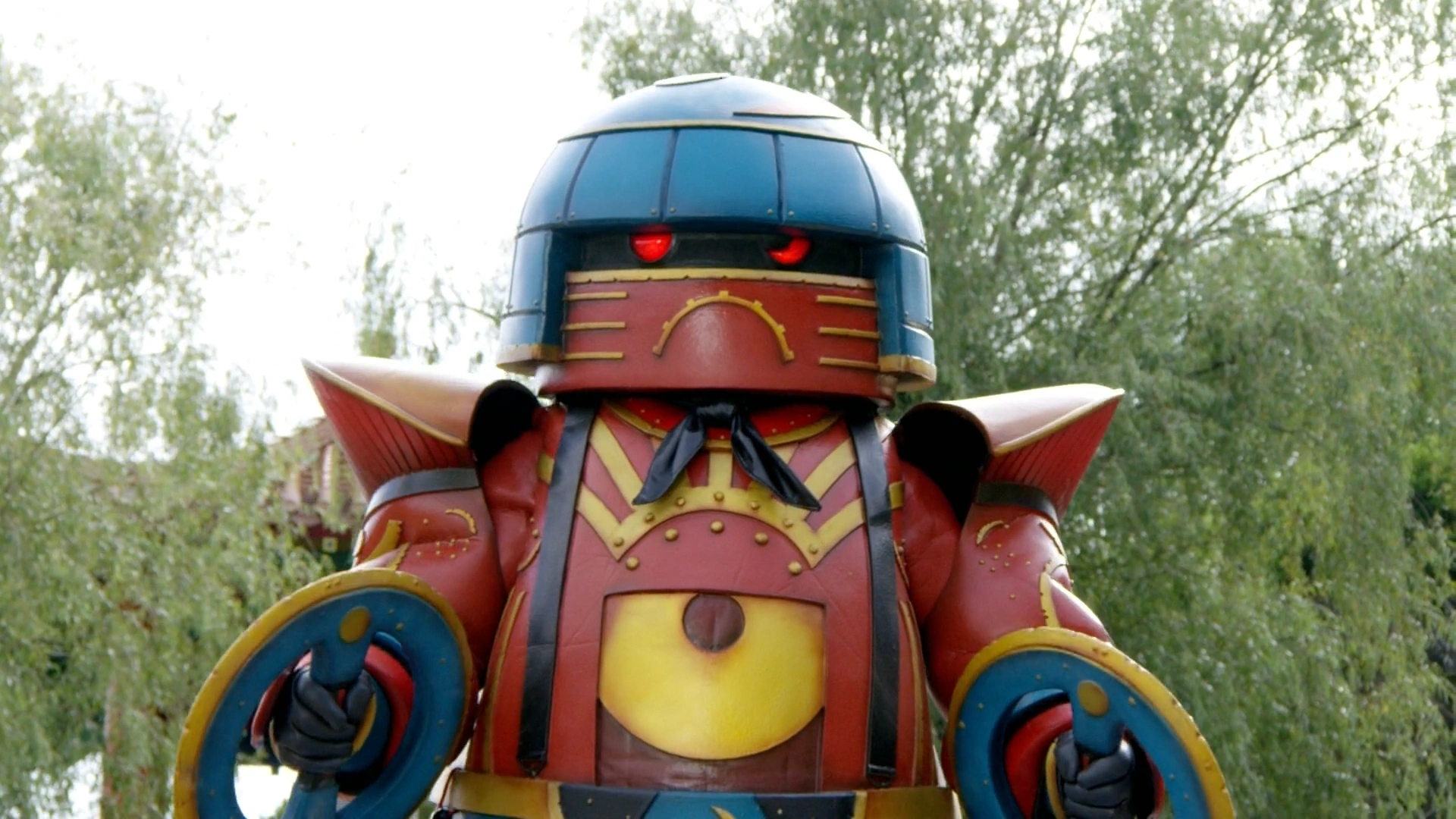 The Kyurangers reunite for the 5th trial where they must dance. They perform to the Kyulette song, but Commander Ronpo’s time to shine is interrupted by him cracking his back again. For the next three chambers, Raptor and Hammie enjoy a soak in the Toei sauna for the 6th trial. Naga and Garu have to make funny faces at Indavers for the 7th trial. But Death Gong seems to be collecting the Kyurangers in discs. Tsurugi and Commander Ronpo are at the Shooting Chamber for the 8th trial. But Commander Ronpo has trouble hitting the targets. Tsurugi takes care of it.