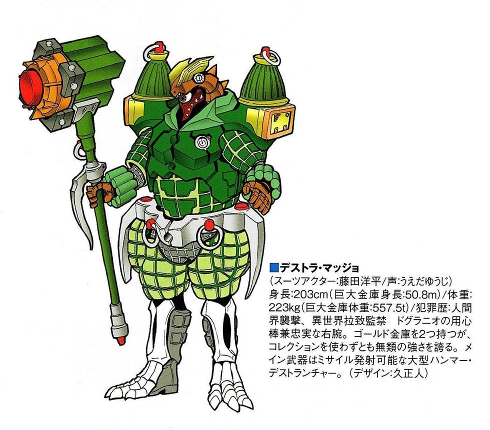 - Destlauncher (デストランチャー Desutoranchā): He carries a large war hammer, which is also a 4-barreled rocket launcher.