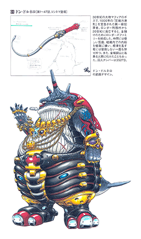 Prisoner #35273, Don Dolnero (ドン・ドルネロ Don Dorunero, 1-47): A blue whale-themed mafioso godfather who is only in it for the money, though he also comes with a firm love for the family. Original leader of the mafia group, the Londerz Family (ドルネロズファミリ Dorunero Famirī). He was to be put under imprisonment for 1,000 years, as Prisoner #35273, until his gang (Lila and Gien) took over the prison and managed to go back in time to pull off numerous crimes. Resembles an overweight middle-aged mafioso in human form. With Borg's help, he took over a company to make even more money, setting up a "protection business". He cares for his associates, especially Gien, whose mental stability often concerns him.