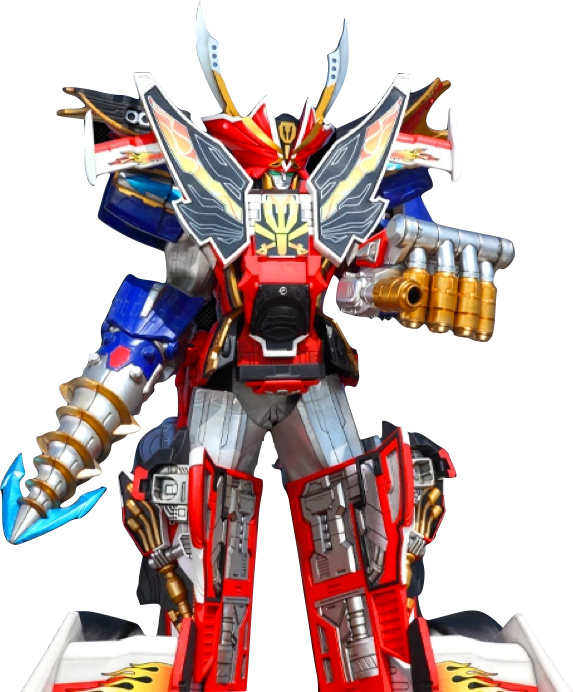 Kanzen GokaiOh (カンゼンゴーカイオー Kanzen Gōkaiō) is the combination of GokaiGalleon, Gozyujin, and Engine Machalcon. In this form, Kanzen GokaiOh attacks with the Kanzen Missiles (カンゼンミサイル Kanzen Misairu) fired from the finger tips of its enlarged left hand, and the Kanzen Drill (カンゼンドリル Kanzen Doriru) slash attack with Gozyujin's drill.