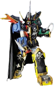 The fake GokaiOh is an evil imitation of GokaiOh with a larger hat bearing a blade, along with an eye patch on its right eye, a traditional "skull and crossbones" jolly roger scheme throughout, a black cape and a large hook in place of the left hand. In addition to two Gokai Ken swords, Fake GokaiOh is armed with a cannon on its left arm and a laser beam on its eye patch. Its main cannon is larger than GokaiOh's Gokai Hō and has five smaller cannons around it. This mode initiated an unnamed finisher where the skull heads on the smaller cannons would open, charge up with blue energy, and then rapid fire missiles at the target. Since this was going to be how Los Dark planned on kill the Gokaigers, this was its strongest attack although it had no effect on the backup mecha. While it appears to have component mecha similar to GokaiOh, it never separates into any other mecha.