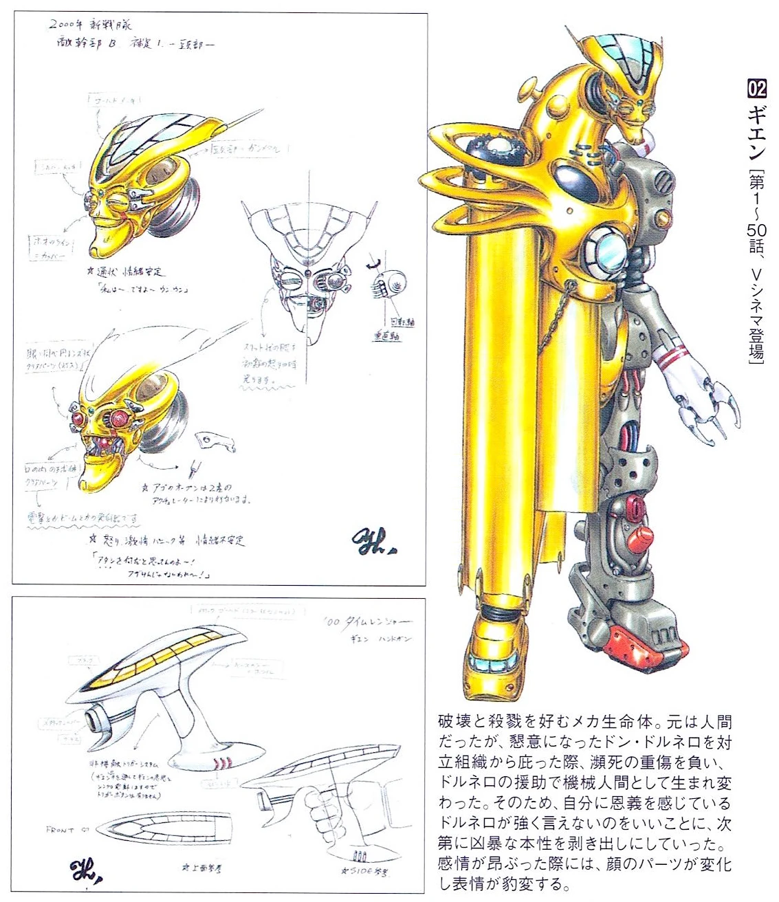 Gien was actually a cyborg, formerly an uneducated, human boy who befriended Don Dolnero in 2990 when he was hiding from the Kuronz Family, who nearly killed Gien for refusing to reveal Dolnero's location to them. Dolnero saved his life by having a friend of his transfer the boy's brain into a robotic body. There were horrible side-effects that made, and still are making, Gien increasingly insane. He had access to the Hell's Gate Prisoners and cared for nothing except for his own maniacal pleasures, going against Dolnero's orders sometimes as well. He also constructed several massive robots, that are powered by the Lambda 2000 crystal he stole from the Kawasaki Laboratories twice. He also attempted to take control of the V-Rex as well.