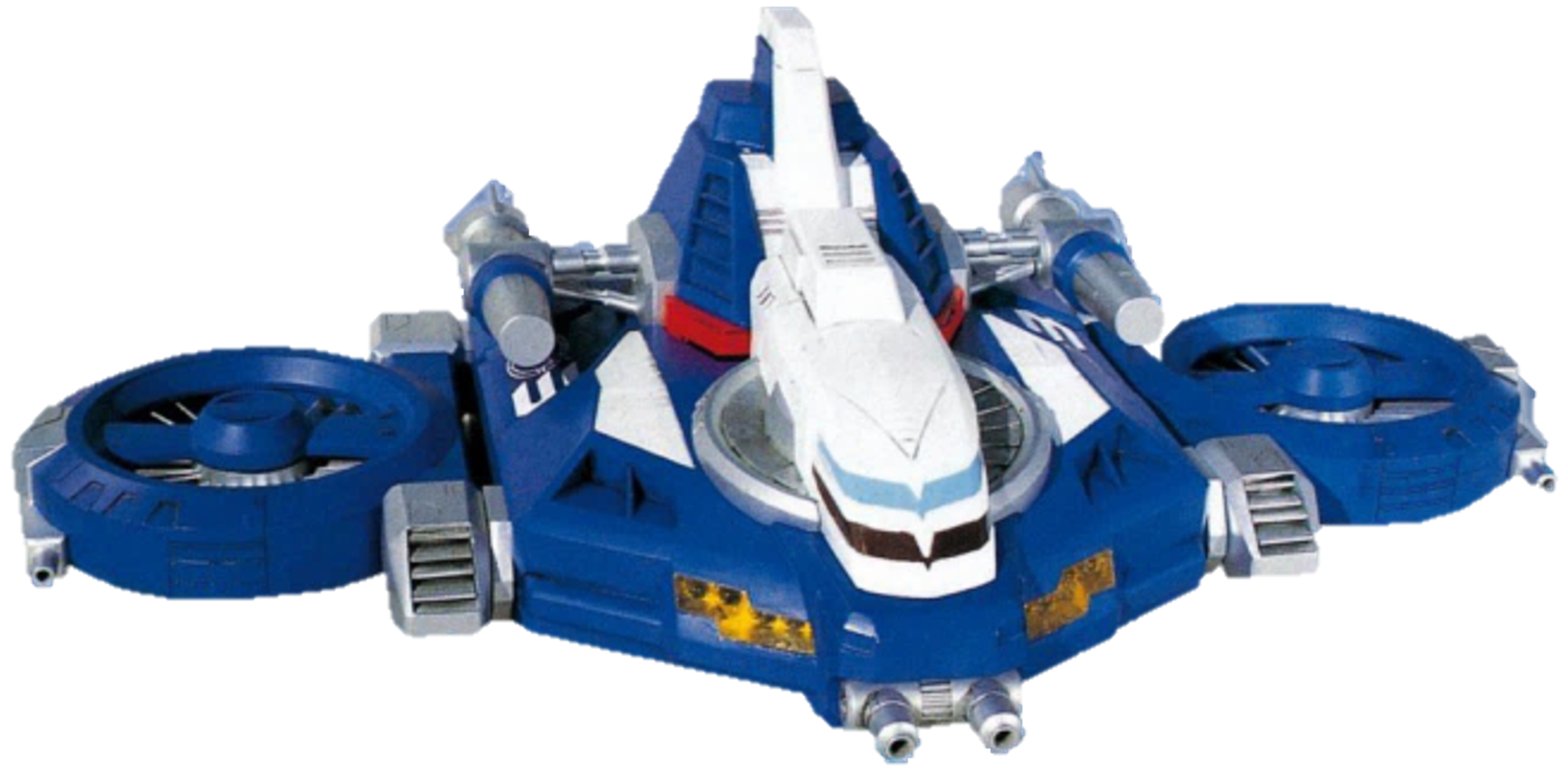The third GoGo vehicle, GoGo Gyro (ゴーゴージャイロ Gōgō Jairo), is piloted by BoukenBlue, who draws his power its Parallel Engine. The GoGo Gyro is equipped with multiple beam cannons and cables that are strong enough to lift the GoGo Marine. Unlike the other GoGo Vehicles, GoGo Gyro is actually two vehicles combined—the part that forms DaiBouken's helmet is an exploration vehicle called Met Lander (メットランダー Metto Randā) with the gyroplane. In the event that DaiBouken becomes immobilized, GoGo Gyro can seperate from the main formation to attack independantly.