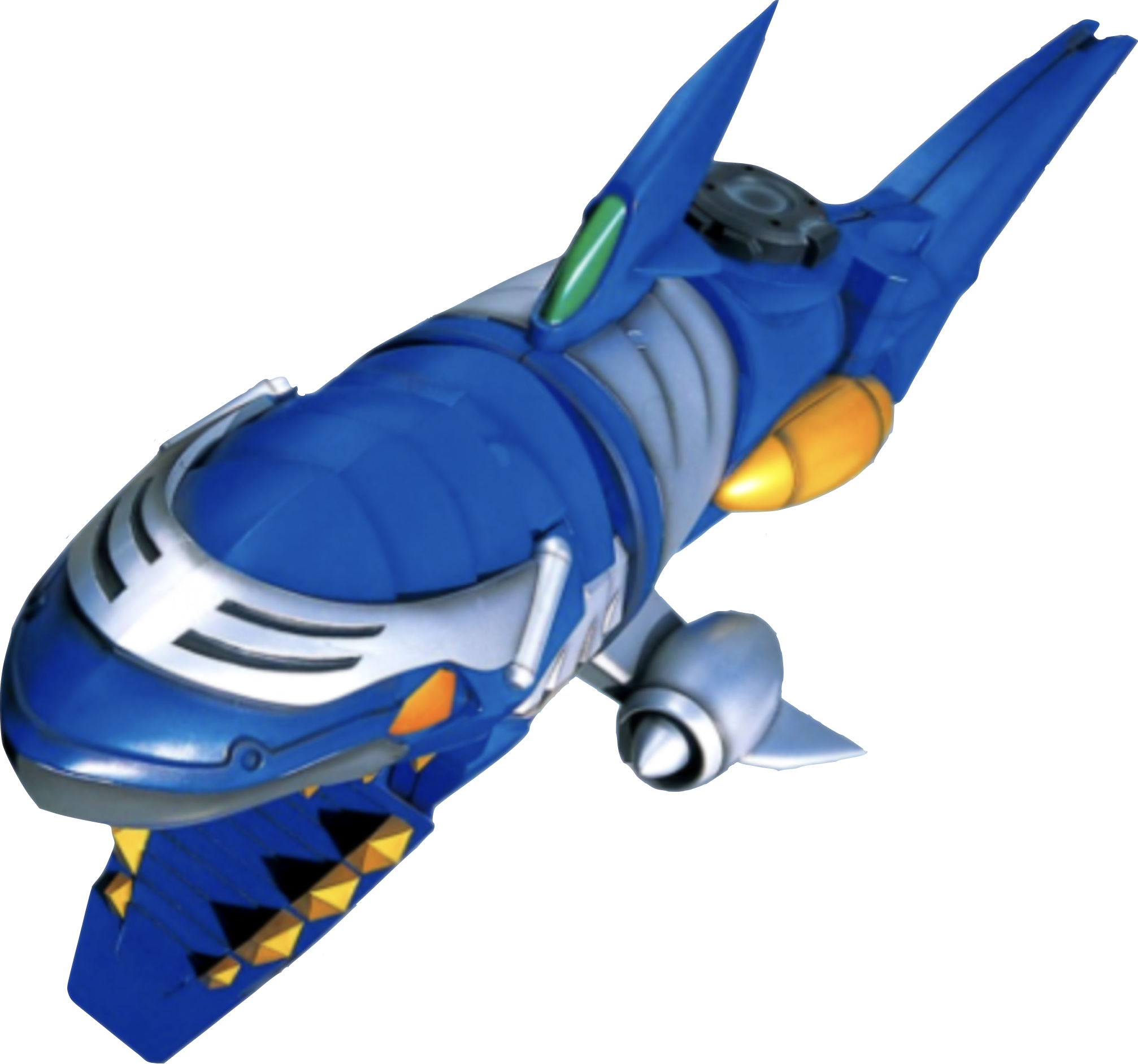 The Gosei Shark Power Card summons the head of the Gosei Shark Mechazord from the Command Center. It fully forms by combining with a submarine as a body, which can attack with torpedoes or seemingly use a powerful bite. It forms Gosei Great Megazord's right arm and Gosei Great Grand Megazord's right shoulder.
