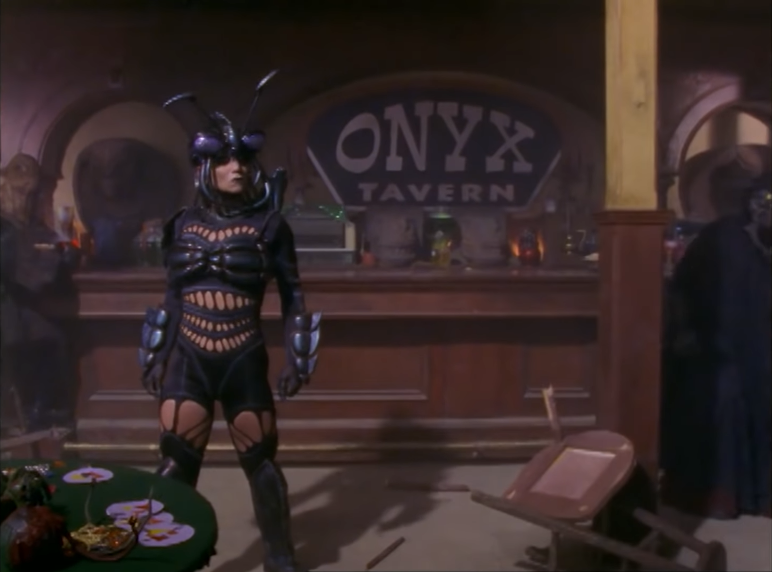 - Among the monsters seen at or around the Onyx Tavern are Rhinoblaster, Fearog, Waspicable, a Barillian Bug's Monster Form, Termitus (sporting Mamamite's arm weapon), Destructoid, Batarax, Soccadillo, Decibat, the black, hornless, and furry version of Robogoat from "Fire In Your Tank," the monster with the head of unused Ninja Sentai Kakuranger monster Karakasa and the body of Hate Master from "Fire In Your Tank," the caped, stinger-mouthed, and shell-less TurbanShell from "Fire In Your Tank," Ninja Sentai Kakuranger monster Ushioni (unused in Mighty Morphin Power Rangers Season 3), Denji Sentai Megaranger monsters Cicada Nezire and Mole Nezire (unused in Power Rangers in Space), Beetleborgs monsters Stego Dreg