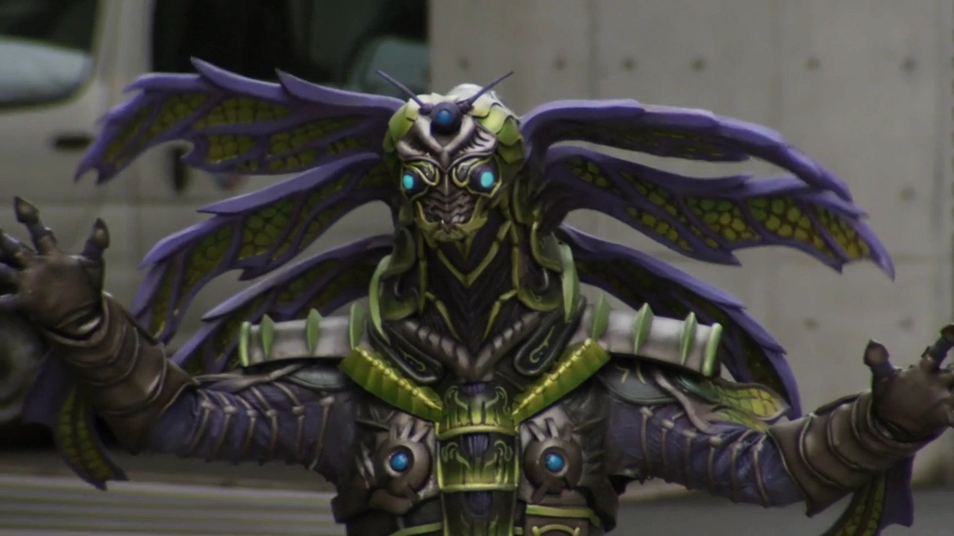 Hidou was summoned by Dereputa to distract or destroy the Goseigers while he dealt with Alata. When he first appeared, the others had a hard time keeping up with his speed, but Alata was able to read his movements with the wind due to his Skick abilities and thus discovered his weakness. However due to Dereputa targeting Alata, the other Goseiger are forced to train using Eri's Twistornado to read the wind and allow for them to fight Hidou on their own. When they face the Warstar Insect again, Alata is once again picked off by Dereputa, but the other four are able to use their training to finally read his speed and hit him with their Gosei Blasters. Using a combination of Hyde's Shark Headder and the Seaick Brothers, the Goseiger defeated Hidou with the Seaick Buster.