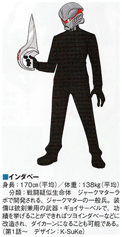 The Indaver (インダベー Indabē), originally known as Inda (インダ Inda), are the footsoldiers of the Space Shogunate Jark Matter.