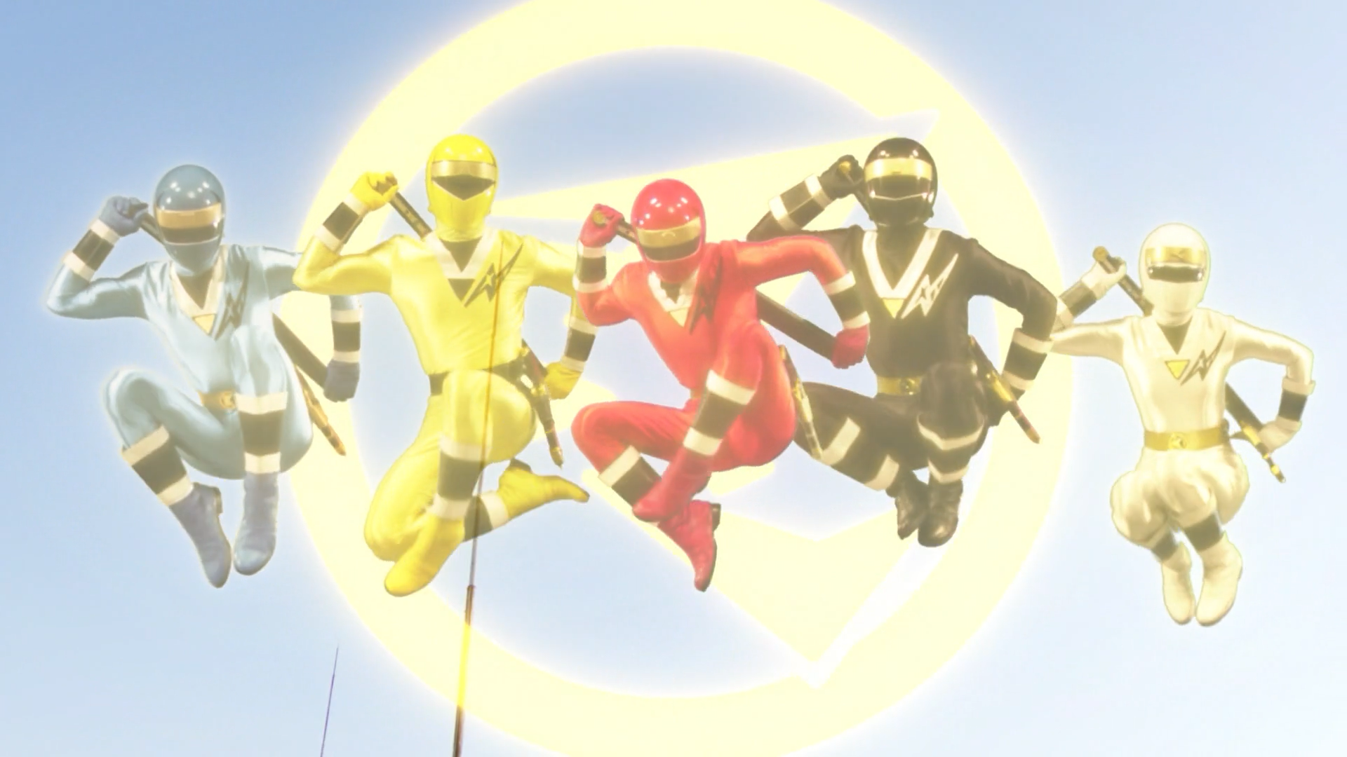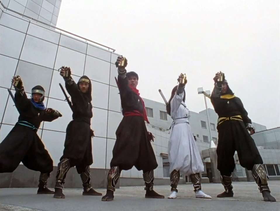 The Kakurangers, alongside the Carrangers, Zyurangers, Dairangers and Ohrangers, emerge through a dimensional wall