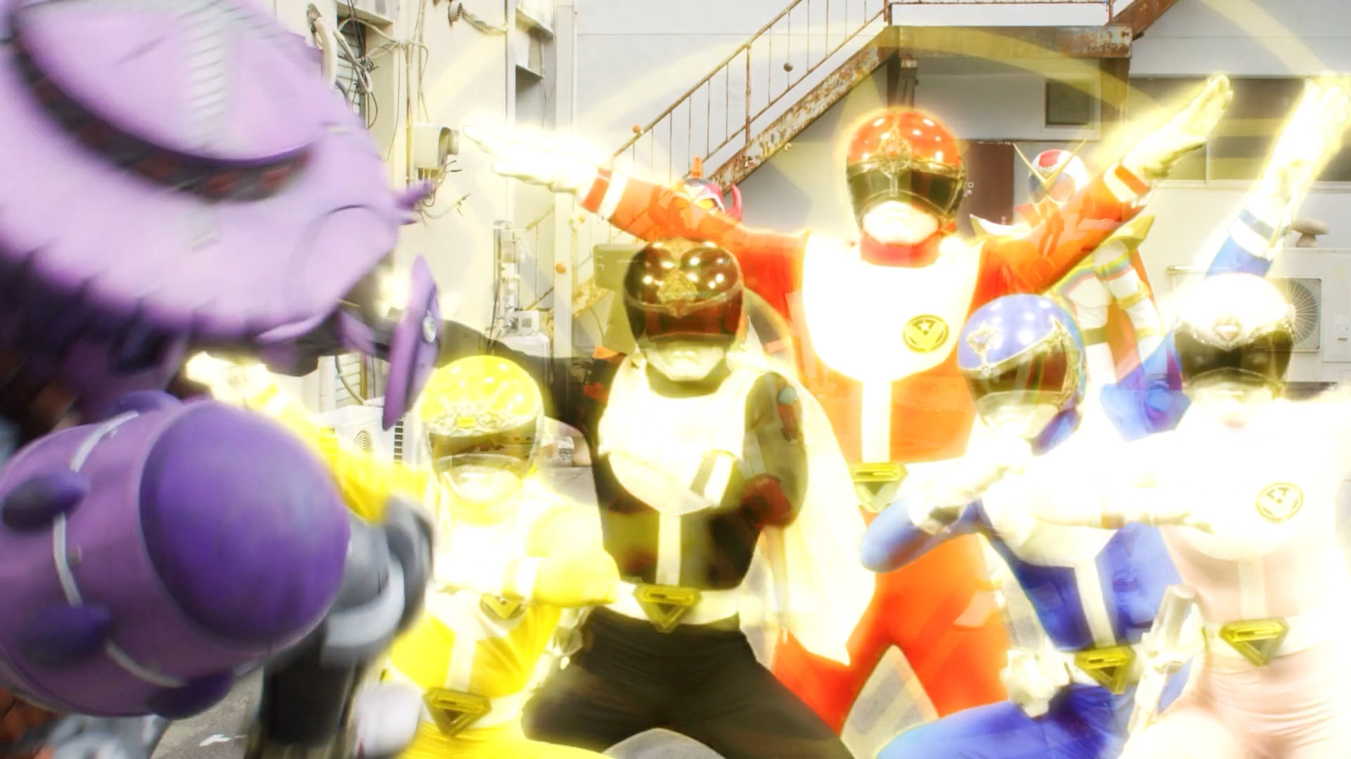 Goggle-V, alongside the Livemen, the Maskmen, Jetmen, and Fivemen, emerge through a dimensional wall