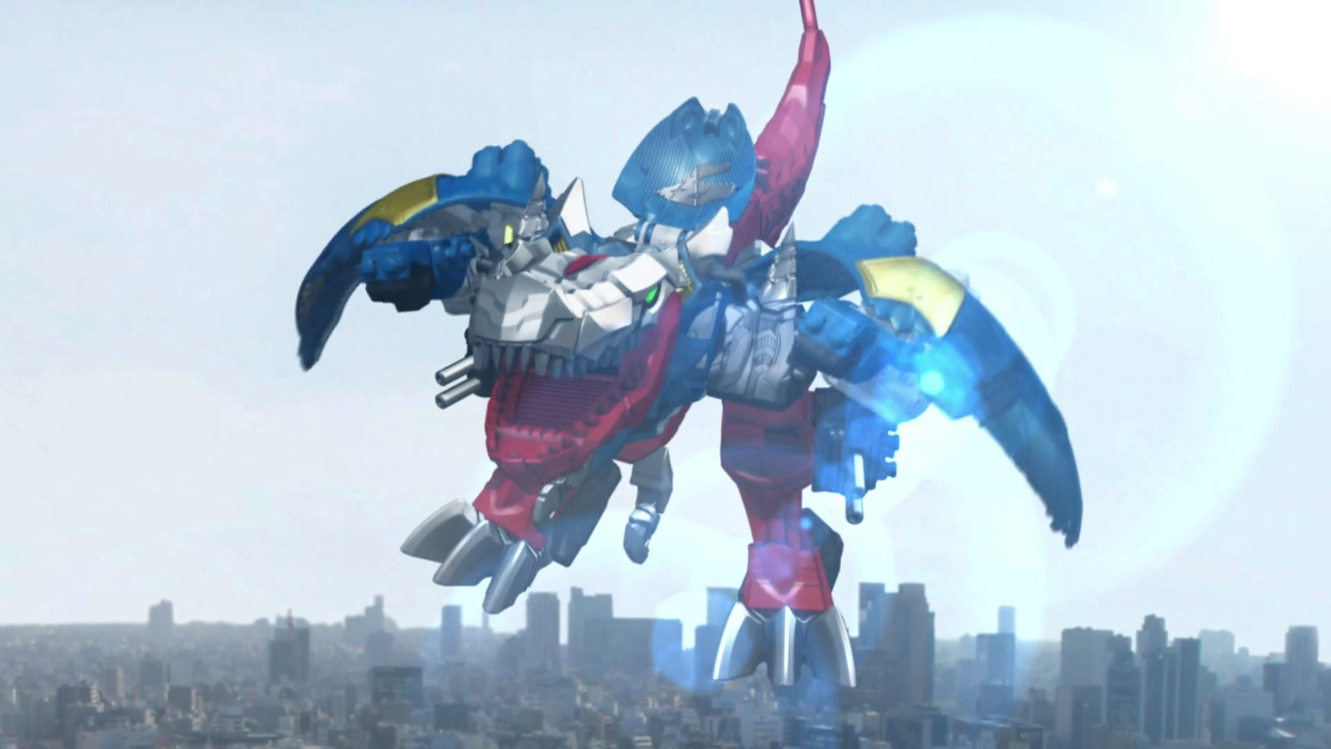 Ryusoul Gattai KishiRyuOh Jet (竜装合体キシリュウオージェット Ryūsō Gattai Kishiryūō Jetto) is the combined form of Kishiryu Tyramigo, Pterardon, Pachygaroo and Chibigaroo. It consists of Kishiryu Tyramigo's head, lower body and legs (with Tyramigo's drills on the knees), and the Red RyuSoul as its head, Pterardon's upper body, arms, the Knight Edge wings and the HieHie Claw placed as a chest plate, Pachygaroo's body splits in two to form the Knight Gloves (ナイトグローブ Naito Gurōbu): Pachygaroo's upper section, with the Knight Thruster (ナイトスラスター Naito Surasutā) on the right arm, and its lower section on the left arm, and Chibigaroo attaches itself to Pachygaroo's head as a visor.