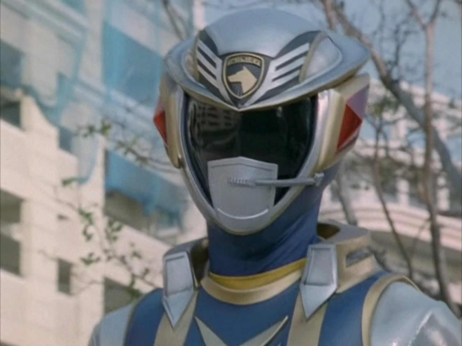 She wore silver spandex with dark blue and gold vest. She also wore dark blue gloves and boots. Her belt buckle held the gold S.P.D. emblem. Her helmet bore the S.P.D. emblem over the visor with a pair of four diagonal stripes between it.