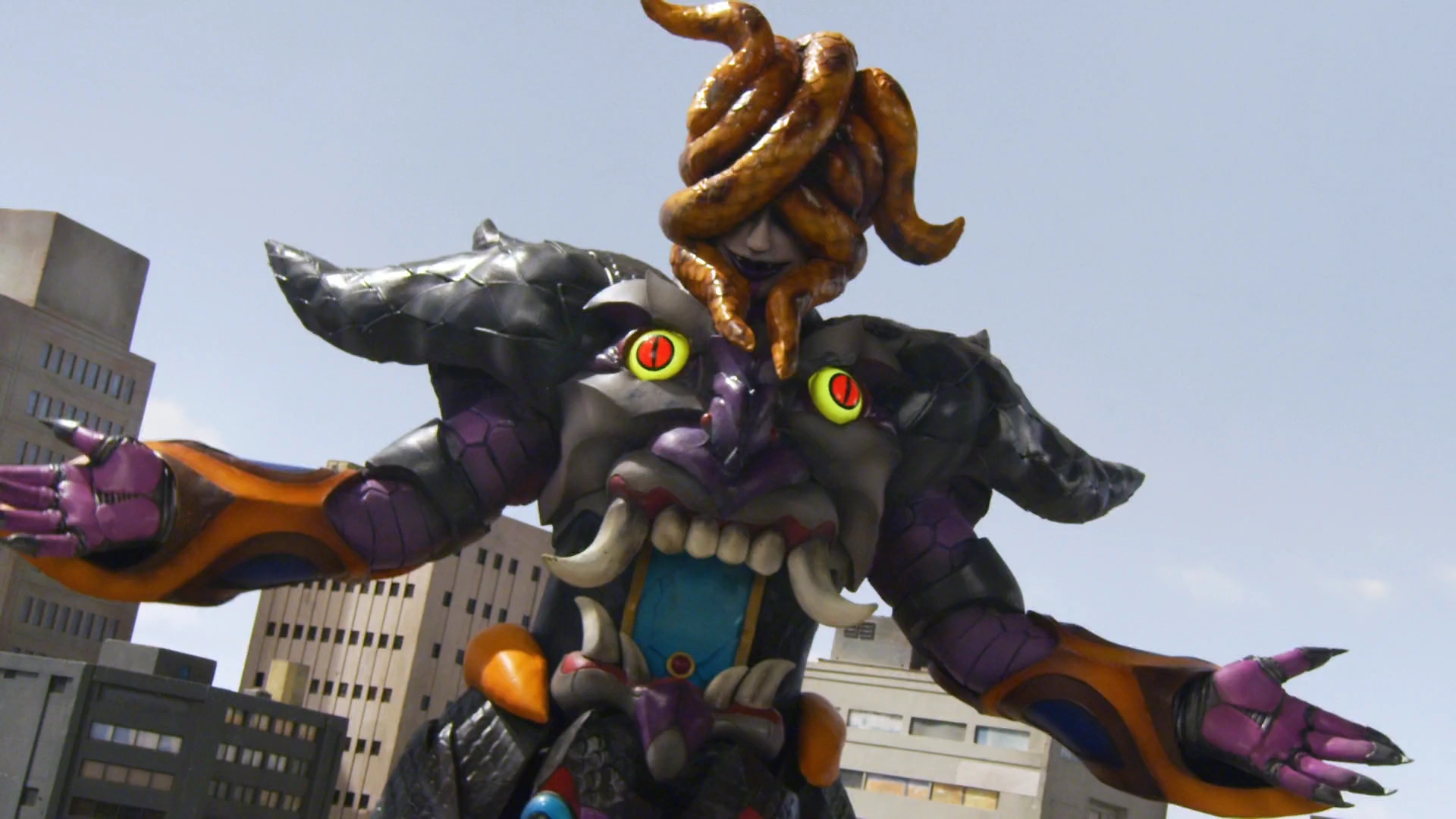 The Medusa Minosaur later returns to Tokyo as a giant who rips through the street so Koh (freed from the petrification by Bamba and the MistSoul) and Melto have to fight it whilst Asuna finds an escaped Ui. As its host gets even weaker, the Medusa Minosaur is able to grow even larger and much of the city via a news-feed. Koh forms KishiryuOh to fights the Medusa Minosaur but struggles to hit its since he has to fight whilst covering his eyes. Using Kishiryu Triken and Kishiryu Ankyloze, they create rubble from the street and then, with a combination of the Karu and GyakuSoul, succeed in covering the Medusa Minosaurs' chest eyes. They then form KishiryuOh Three Knights which the Medusa Minosaur finds itself helpless against and is destroyed by the Final Blade attack.