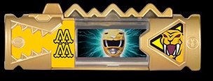 As part of NYCC 2015, Bandai released an exclusive Dino Charge Mighty Morphin' Movie Charger set with each Dino Charger depicting four pictures.[1] In Mighty Morphin' Yellow's case, it featured her Ranger form, the Power Beams, the Bear NinjaZord, and the MMPR Movie title.