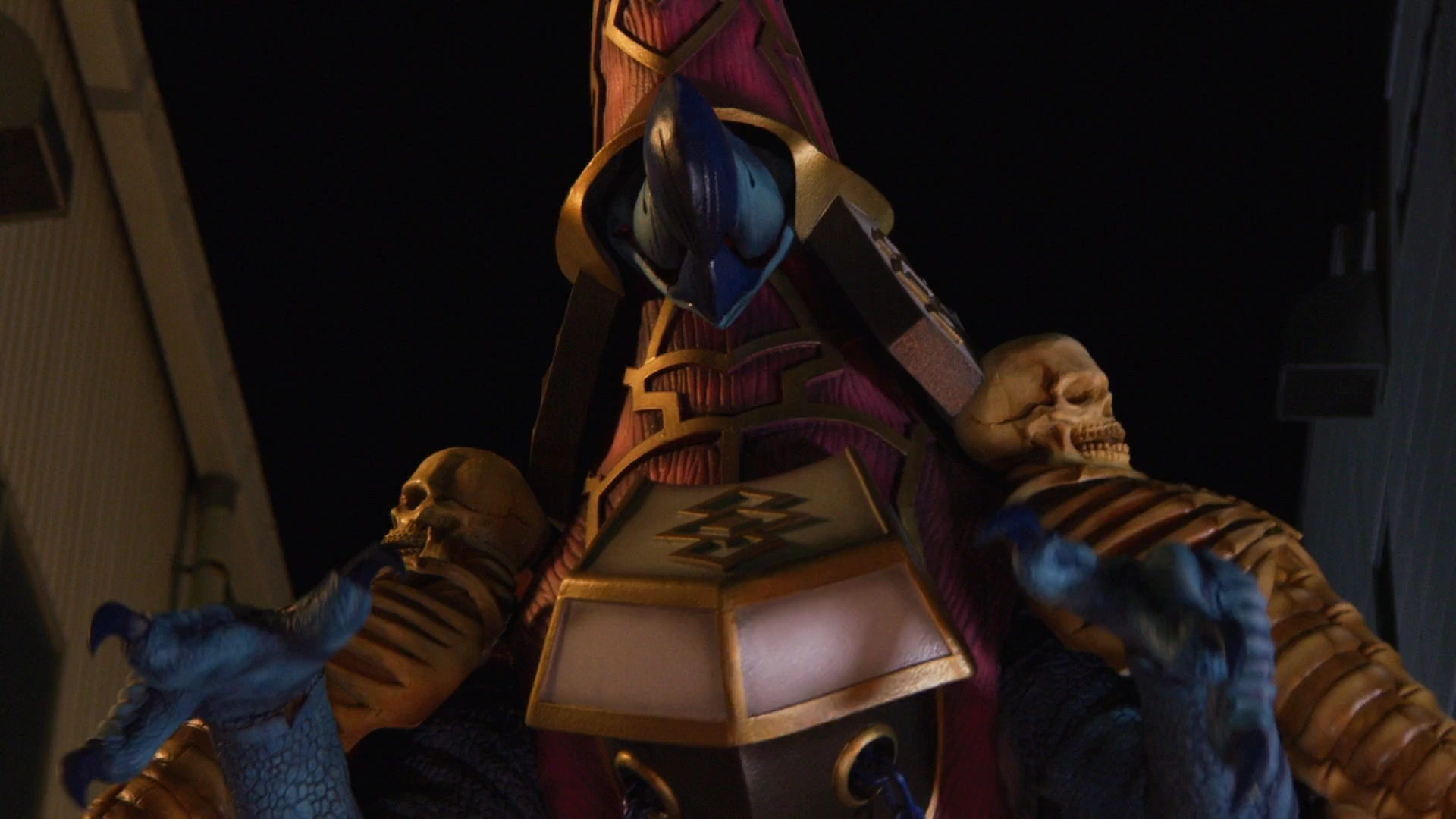 , a wizard or a witch who can reanimate the dead. His face resembles a carrion bird such as a vulture or buzzard.