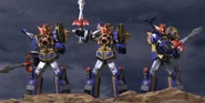 When GokaiOh and Gosei Great faced the Black Cross Colossus, the mecha of the first 33 Super Sentai, including Senpujin which possibly manifested from a toy version like DaiDenzin and the Variblune, appeared to back them up. When the Black Cross Colossus summoned several giant villains to oppose them, Senpujin fought alongside ShinkenOh and Muteki Shogun to destroy Buredoran of Chimatsuri. After all the giant villains were destroyed, all 35 mecha weakened Black Cross Colossus with a combined attack before GokaiOh combined with the Variblune to become Goren GokaiOh which destroyed the Black Cross Colossus with the Gokai Hurricane: Cassiopeia finisher. With the battle won, the 33 past Super Sentai mecha vanished.