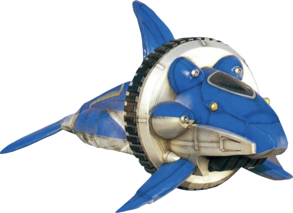 HurricaneDolphin (ハリケンドルフィン Hariken Dorufin) is HurricaneBlue's personal mecha in the form of a giant robotic blue dolphin with ninja water magic. When Oboro launches it from the hangar, it removes the cloak from when it is posing as a luxury yacht liner. Its attacks are the Karakuri Ninpou: Big Harbor Wave (カラクリ忍法・大津波 Karakuri Ninpō: Ōtsunami), a hologram of a tsunami used to distract and intimidate opponents, and the Dolphin Attack (ドルフィンアタック Dorufin Atakku) where it bounces an opponent on its snout before slapping them away with its tail. It also is armed with four beam guns around its head. Forms the right arm of Karakuri Giant Senpujin, Karakuri Giant Gourai Senpujin's right shoulder cannon, and switches with Karakuri Giant Tenkujin to form Tenku Senpujin. HurricaneDolphin is the only Shinobi Machine left out of the Karakuri Giant Tenrai Senpujin formation.
