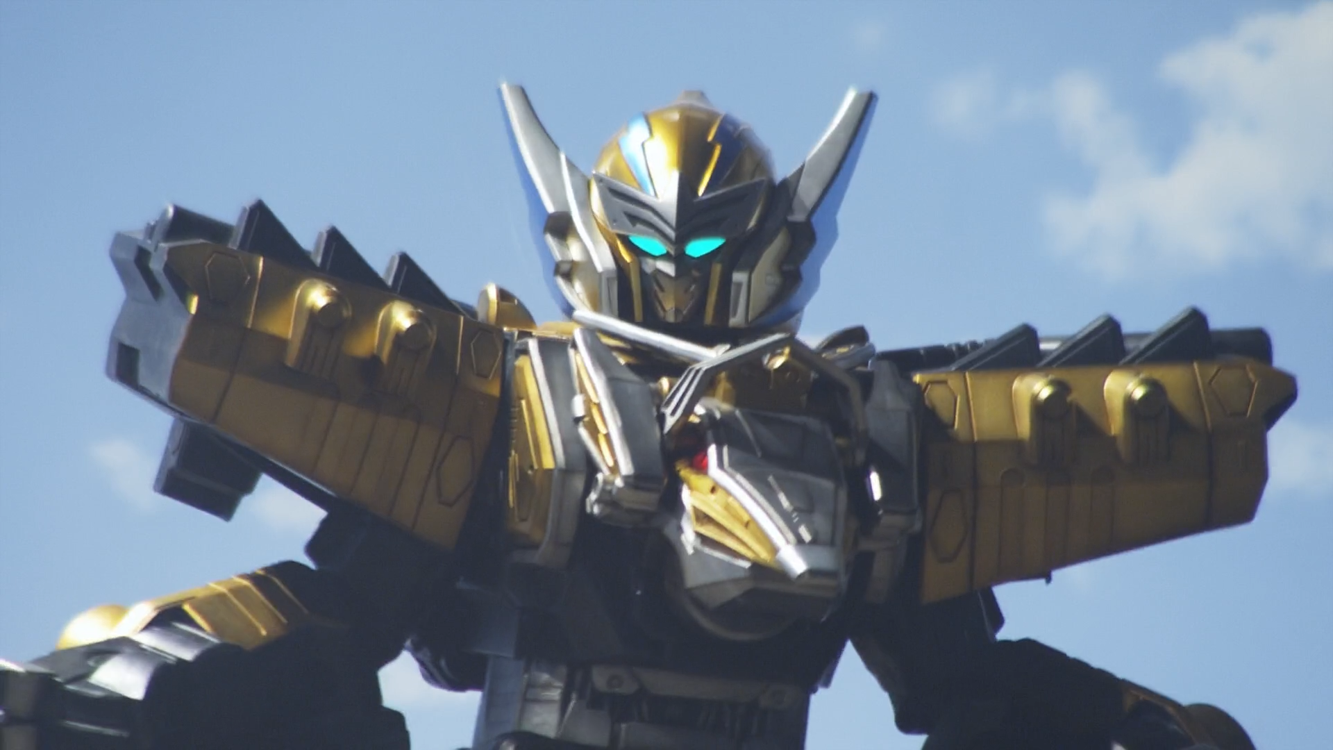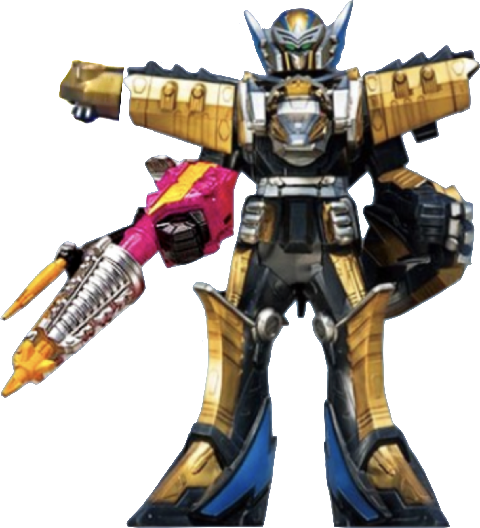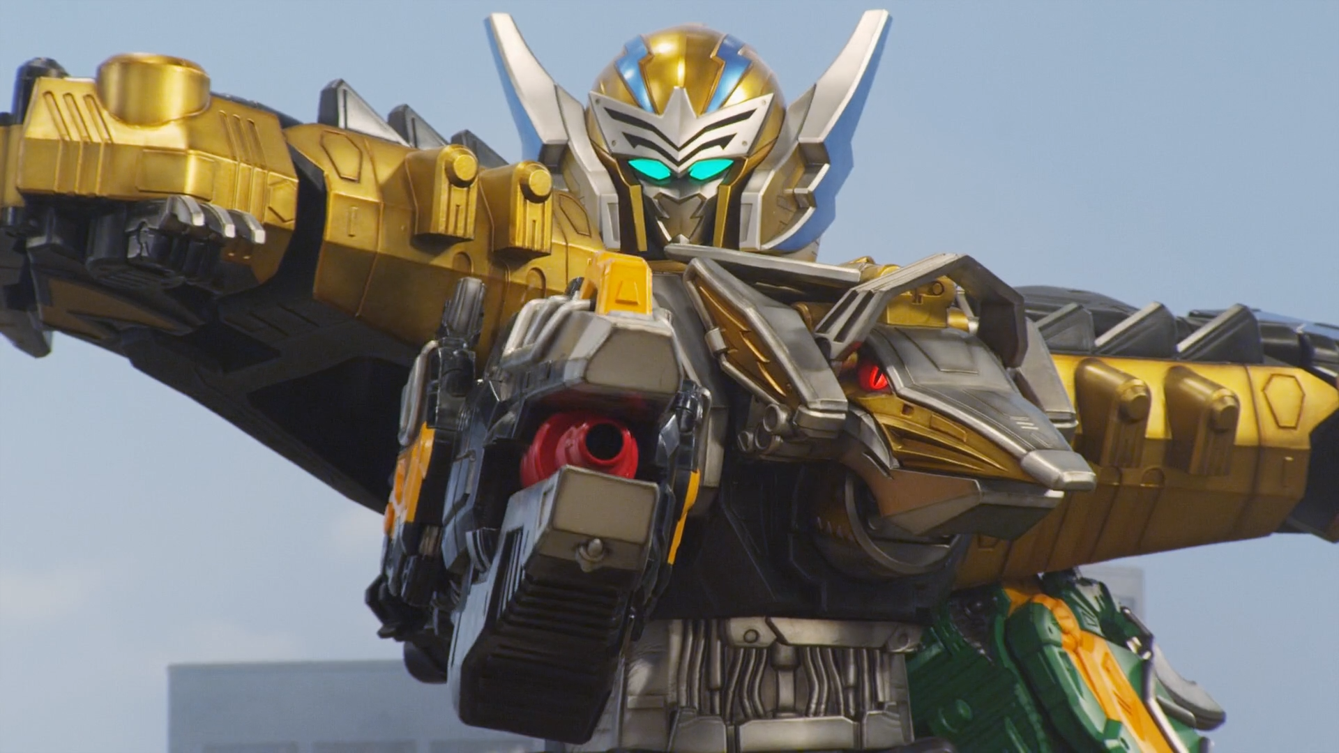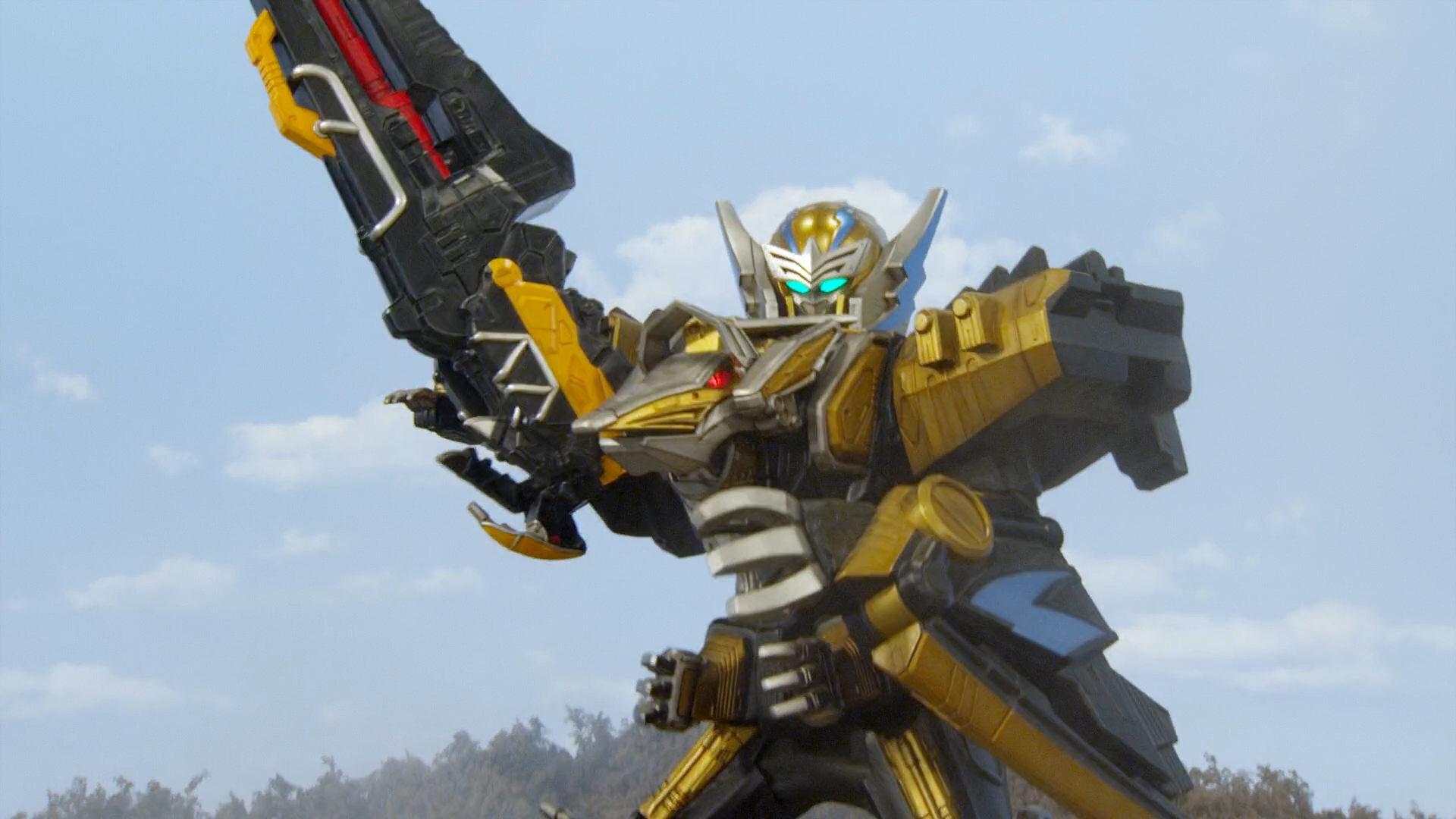In this form, the Megazord gains the Tricera Zord as a drill arm.