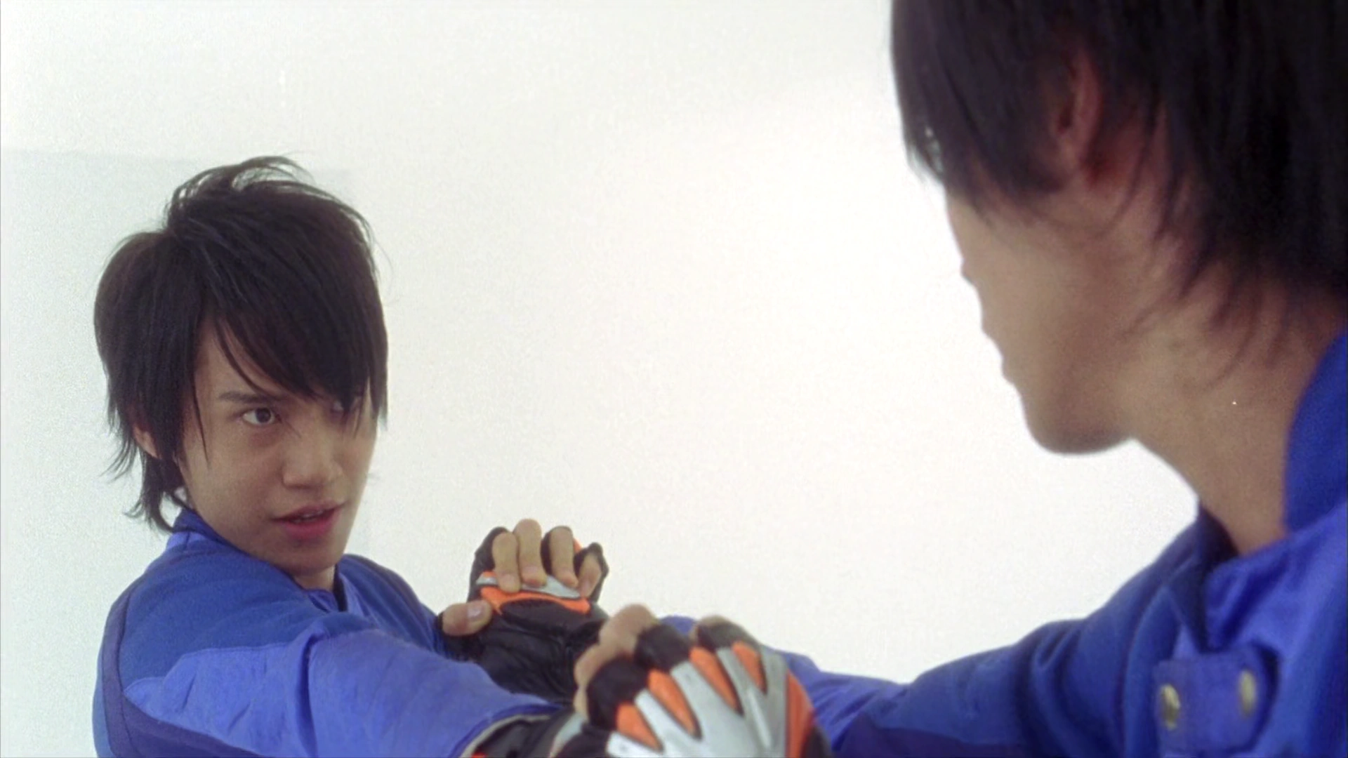 The doppelganger of Retsu was created by Shiyuu. He used it as a revenge for Retsu cracking Shiyuu's armor with GekiFan. When he is in the shower room, he looks at himself in the mirror, when he turns away, his reflection moves differently. Retsu gets confused, touching the mirror, and the reflection pulls Retsu into the mirror. The doppelganger of Retsu was played by his actor's twin brother Shinpei Takagi. TV STORY-Lesson 38: Biba-Biba! Another Retsu