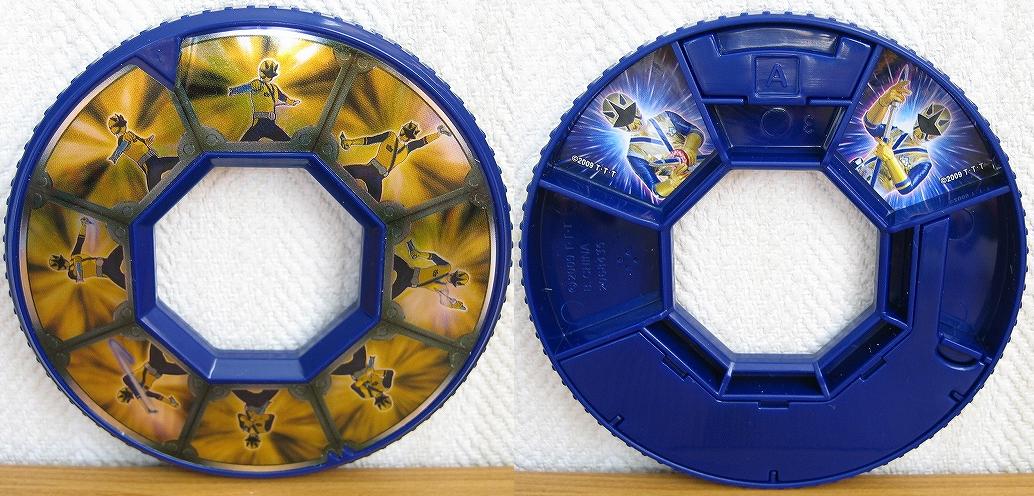 This Double Disk (双ディスク Sō Disuku) created by Toshizo Tanba based on his specialty mojikara allows whatever weapon the disk is used on to double up. It was used by Shinken Red for the Rekka Daizantou and by Gokai Blue (as Shinken Blue) with the ShinkenMaru.