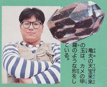 Kameo (亀夫) is Daimugen's current human incarnation, first introduced in episode 22, Kameo is a pudgy and child-like man who loved turtles and was fearful of confrontations. He spoke in a Nagoya accent and with no memory of his previous life, made a living out of selling his illustrations and dreamed of writing children's books. In his first appearance, Kameo was out playing with his pet turtles when he witnessed the Dairangers perform the ceremony to give birth to Mythical Qi Beast Won Tiger, only to be scared off by Byakko. Kameo would later cross paths with Rin and Shoji when he was running from the Three Gorma Stooges in episode 24 who kidnapped him to serve as umpire for the baseball game between them and the Dairangers.