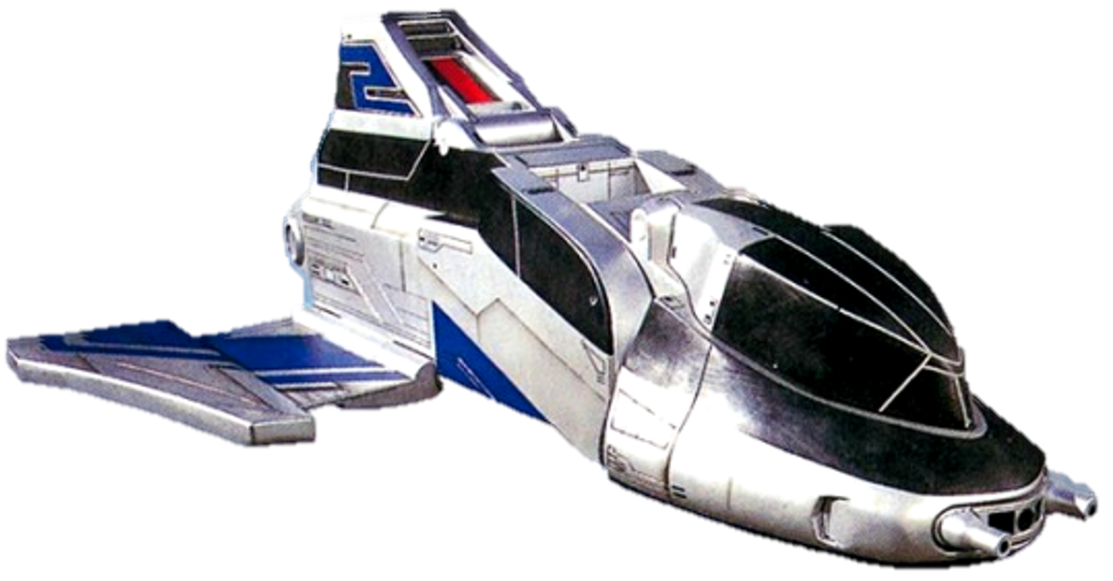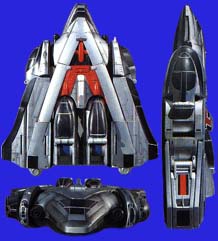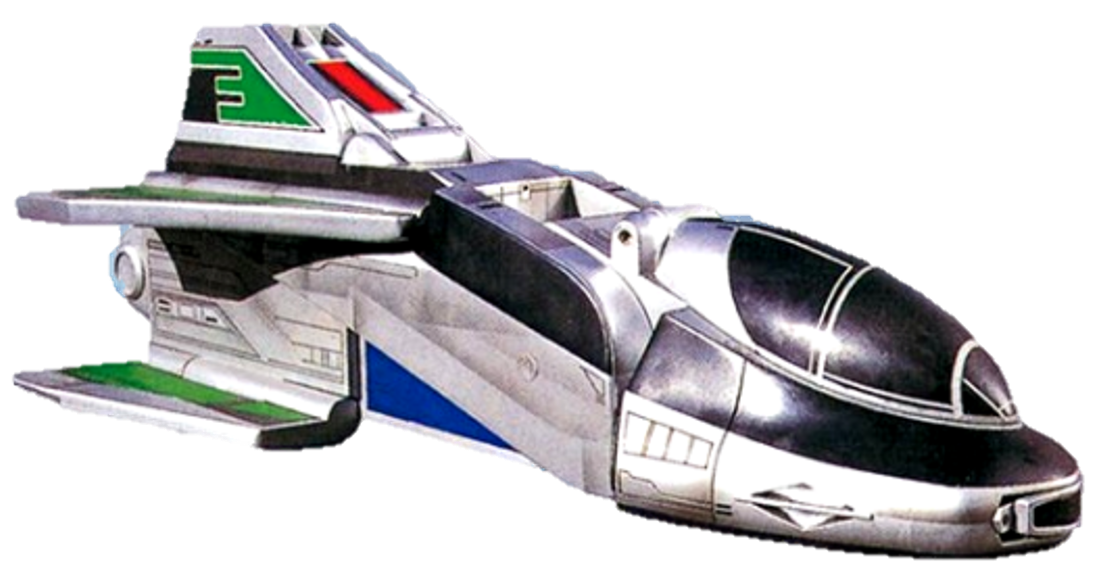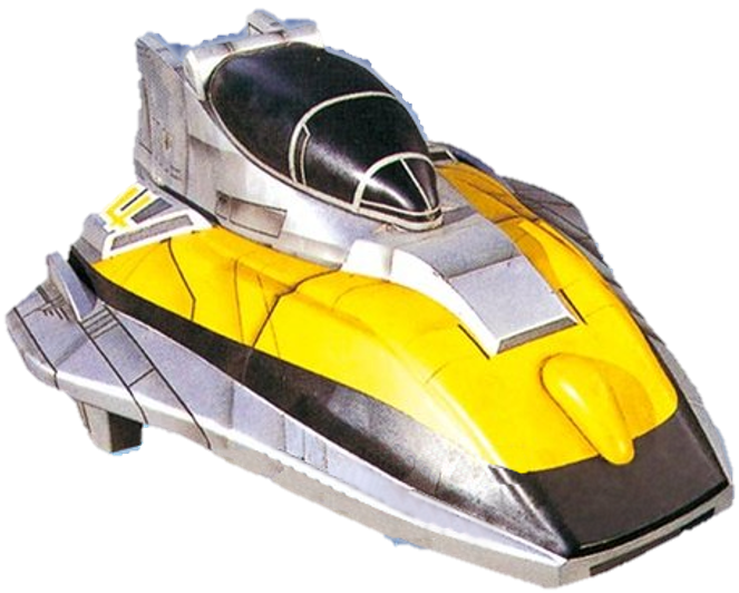 Time Flyer 1, piloted by Wesley Collins. Forms the frontal segment of Jet Mode. Time Flyer 1's underside is Time Force Megazord Mode Red's chest, while the topside is the chest of Time Force Megazord Mode Blue. Forms the body and head of Time Force Megazord Mode Red and Mode Blue.
