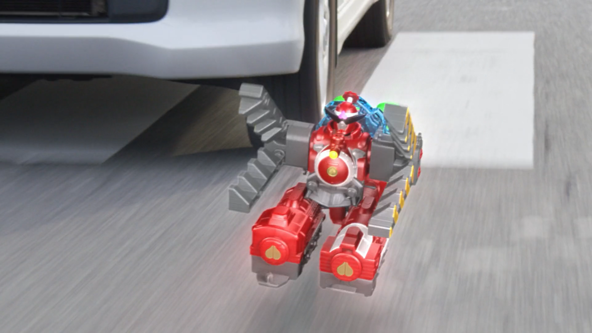 The ToQger Alter would make its first appearance during a chase against Kuro kuma’s delivery van, combining with the Momotaro Alter to form the ToQ Momotaro Alter and zipping around the traffic before using the form’s twin pinchers to pop the delivery van’s tires, forcing Kuro Kuma to crash his vehicle and attempt to flee on foot, but is then confronted by Taro and Haruka.