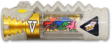 V. Victory (ビクトリー Bukutorī) - A transparent silver Zyudenchi showing the icons for Zyudenryus 1-5. Used by Kyoryu Red Carnival. When used in the Gabutyra De Carnival, it unleashes a finishing attack that combines the power of the first five of the Ten Great Zyudenryu.